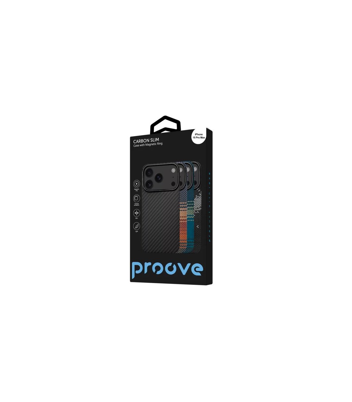 Kompletacja: W zestawie znajduje się etui Proove Carbon Slim with Magnetic Ring do iPhone 15 Pro Max.