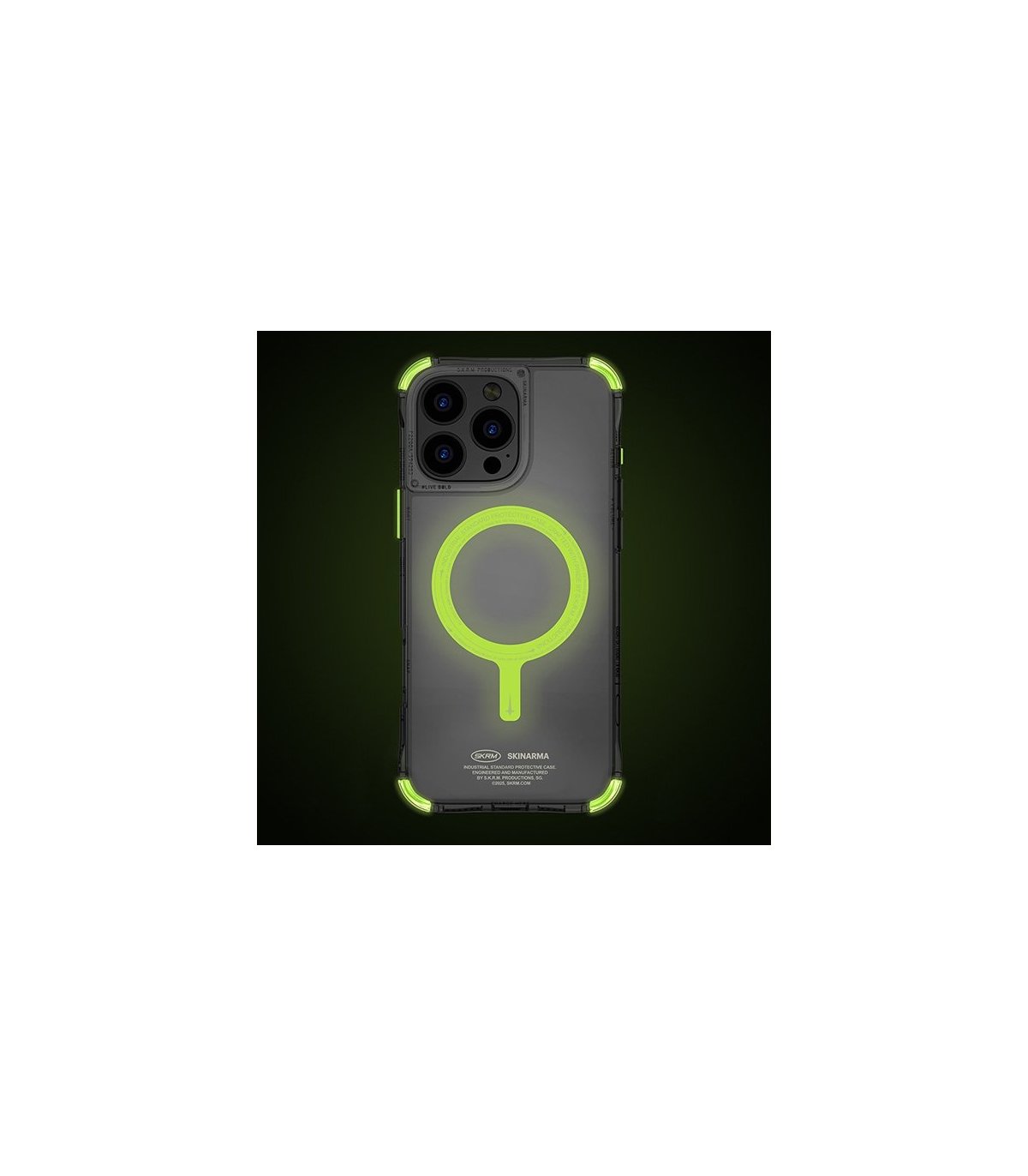 - Fotoluminescencyjne elementy (niteglow) – świecący w ciemności pierścień mag-charge oraz narożne bumpery przyciągają uwagę i poprawiają widoczność telefonu nocą.