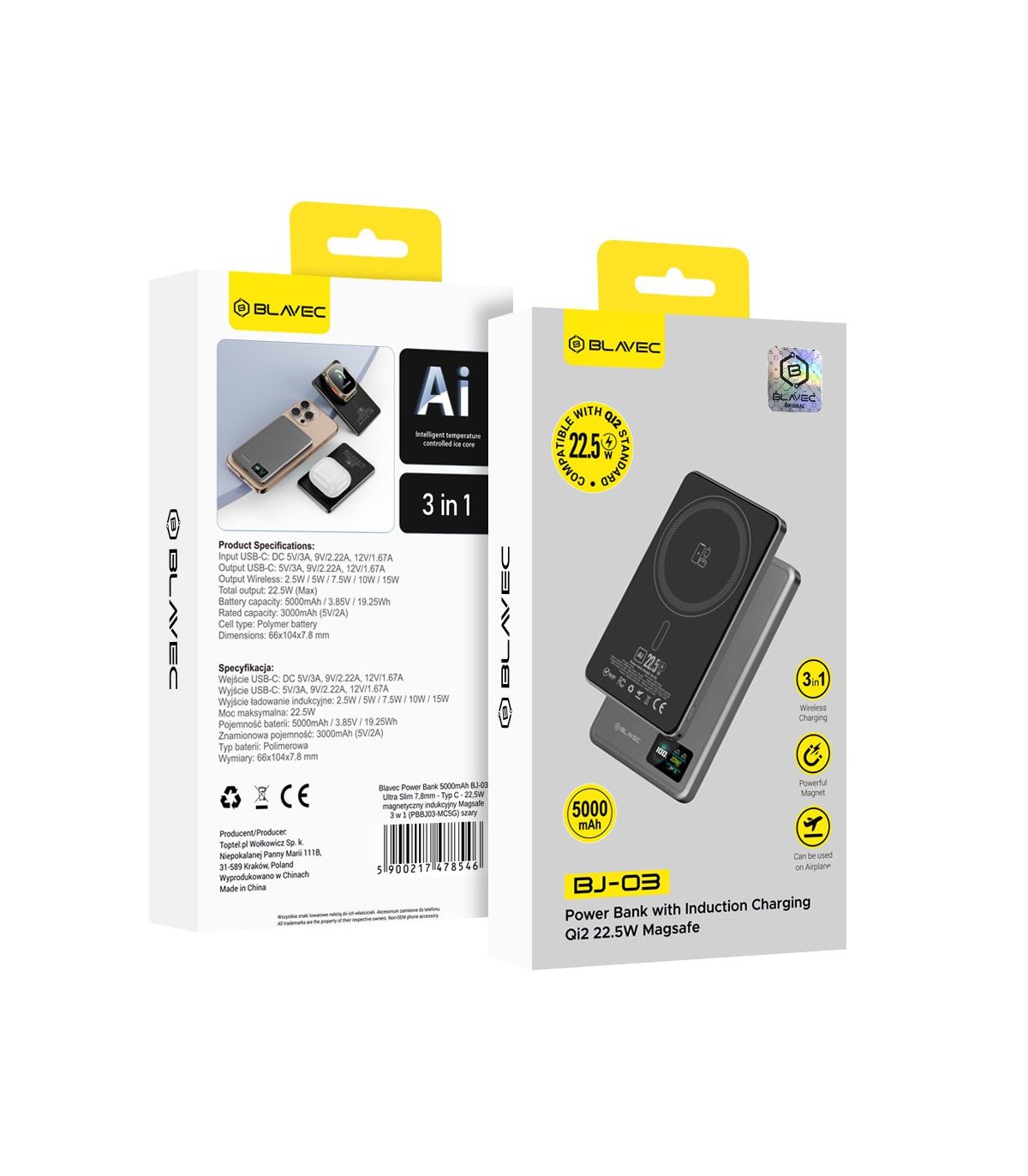 Model / Pojemność / Kolor: Blavec Power Bank 5000mAh BJ-03 Ultra Slim 7,8mm - Typ C - 22,5W magnetyczny indukcyjny Magsafe 3 w 1 (PBBJ03-MC5G) szary.